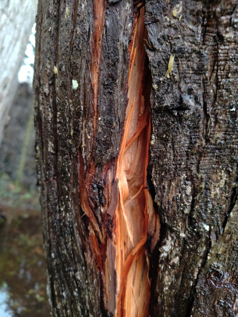 - Un suintement orangé ou violacé sur l’écorce, sorte de pleur chimique.