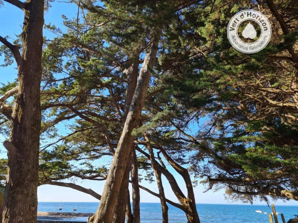 Avant d’aller plus loin, précision utile : nous parlons ici du cyprès de Lambert isolé, planté comme arbre ornemental. Pas des haies taillées deux fois l’an, ces murs végétaux malmenés à coups de taille-haie. Non : l’arbre entier, avec son houppier généreux, sa ramure sculptée par les embruns.